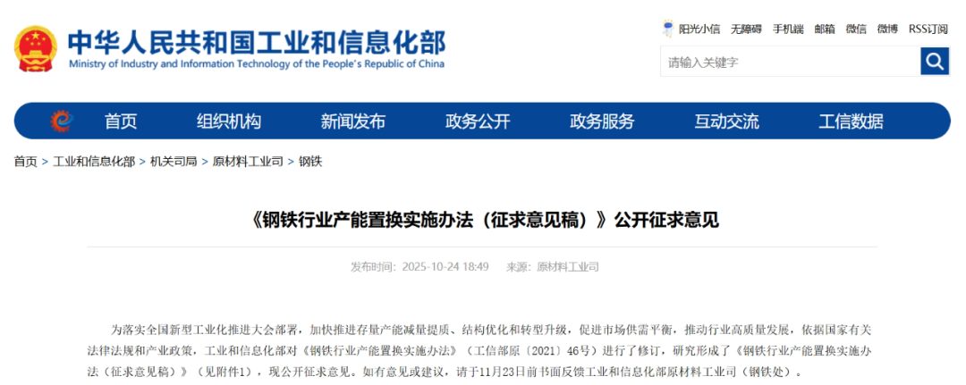 工信部网站10月24日消息,工业和信息化部对《钢铁行业产能置换实施办法》进行了修订,研究形成了《钢铁行业产能置换实施办法(征求意见稿)》,现公开征求意见。